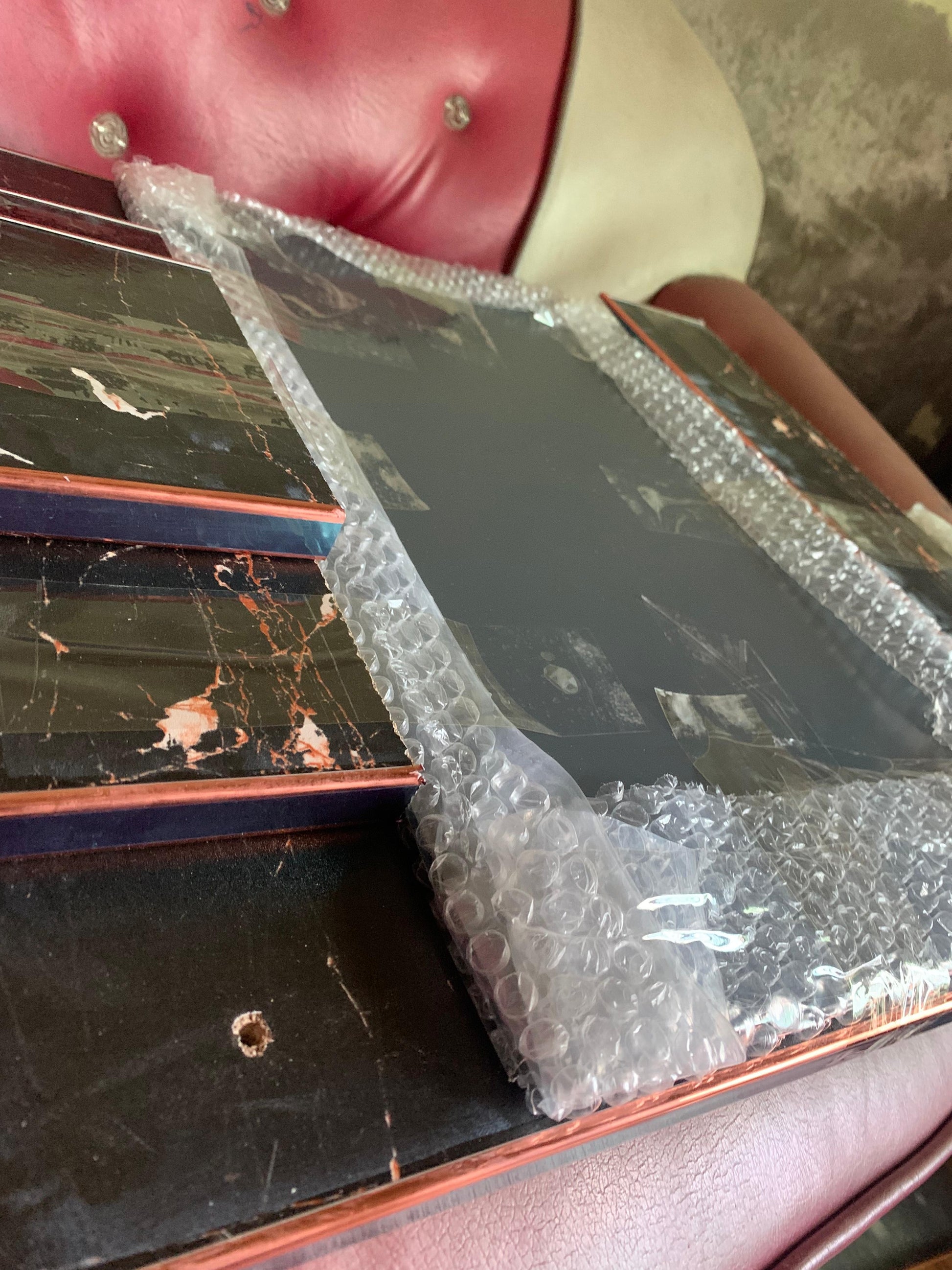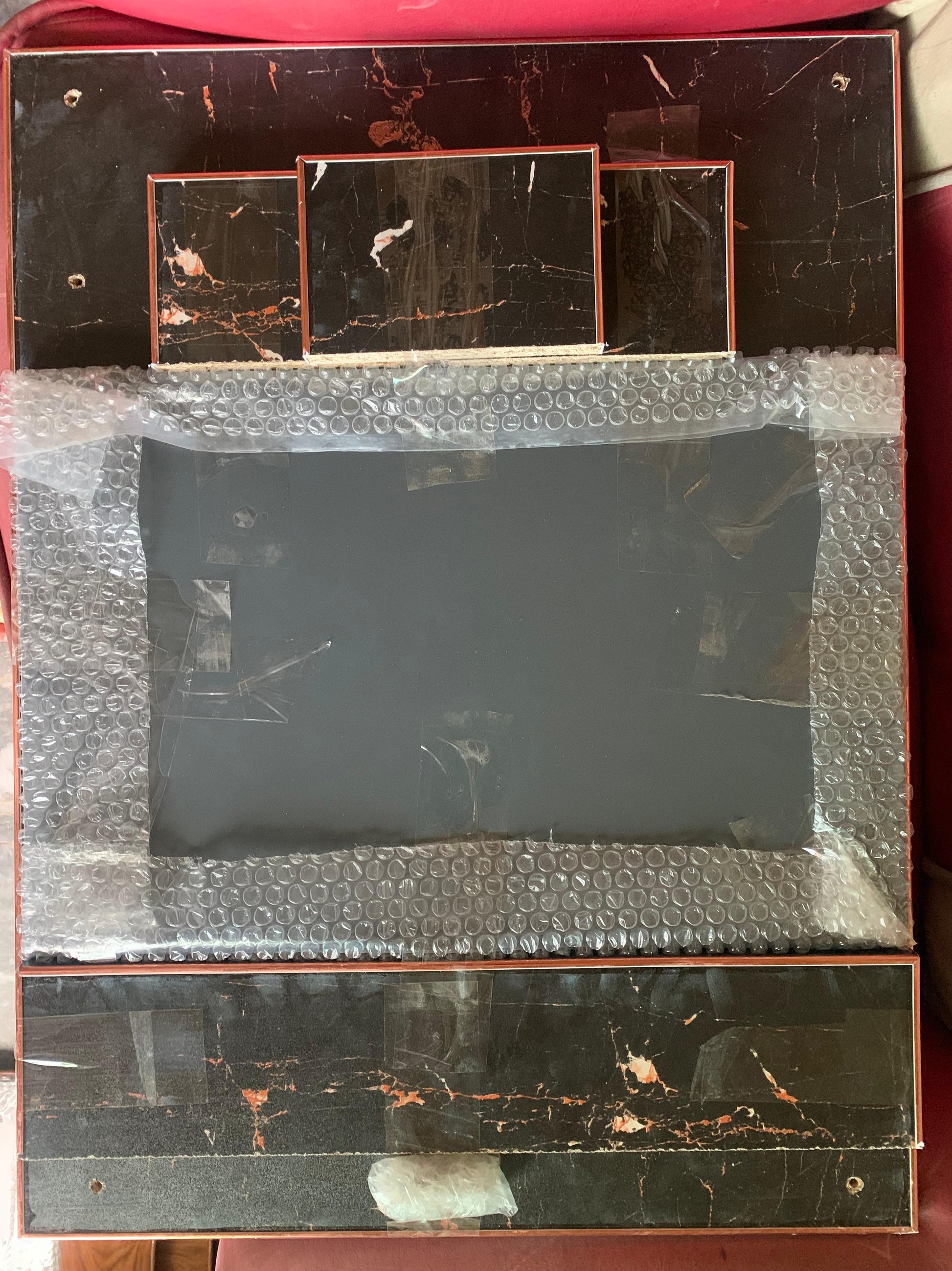 Unpack the dressing table and identify all included parts and mounting hardware.